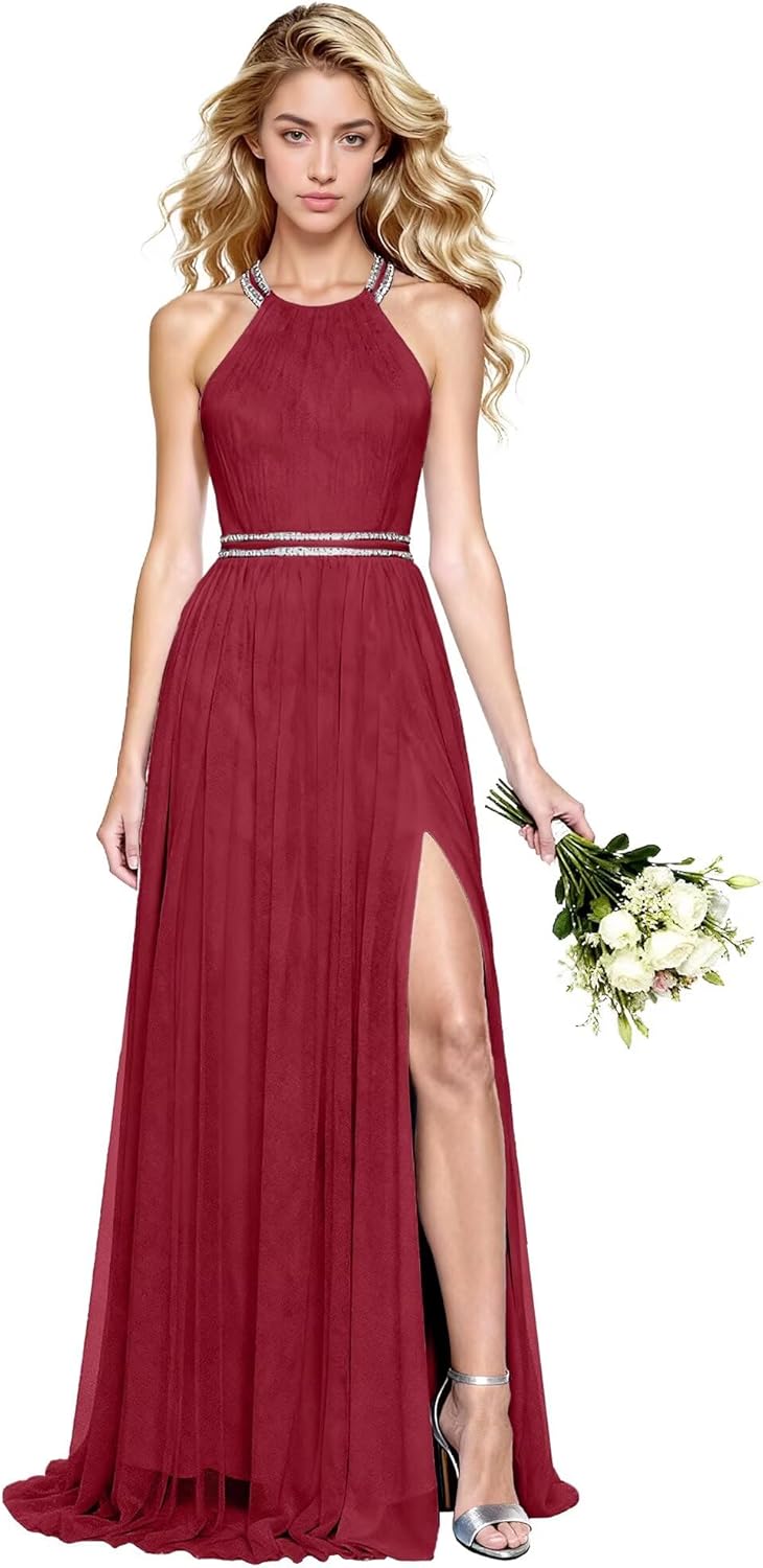 Women's Tulle Bridesmaid Dresses Halter Wedding Party Gowns Sleeveless Prom Evening Dresses with Slit