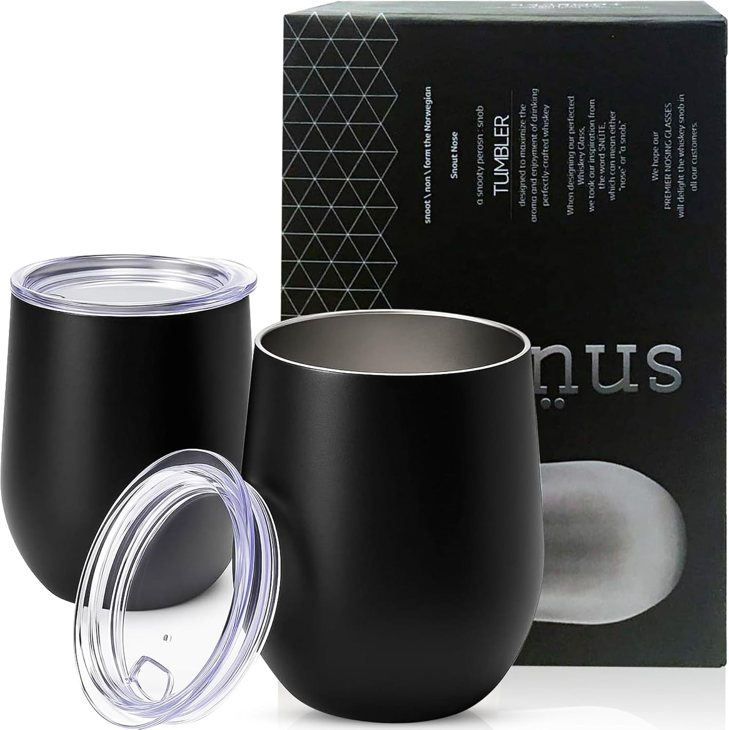 Double-Wall Insulated Whiskey Glass - 12 oz Stemless Nosing Stainless Steel Whisky Glass - Perfect for Bourbon and Whisky Lovers (Black - Pack of 2)