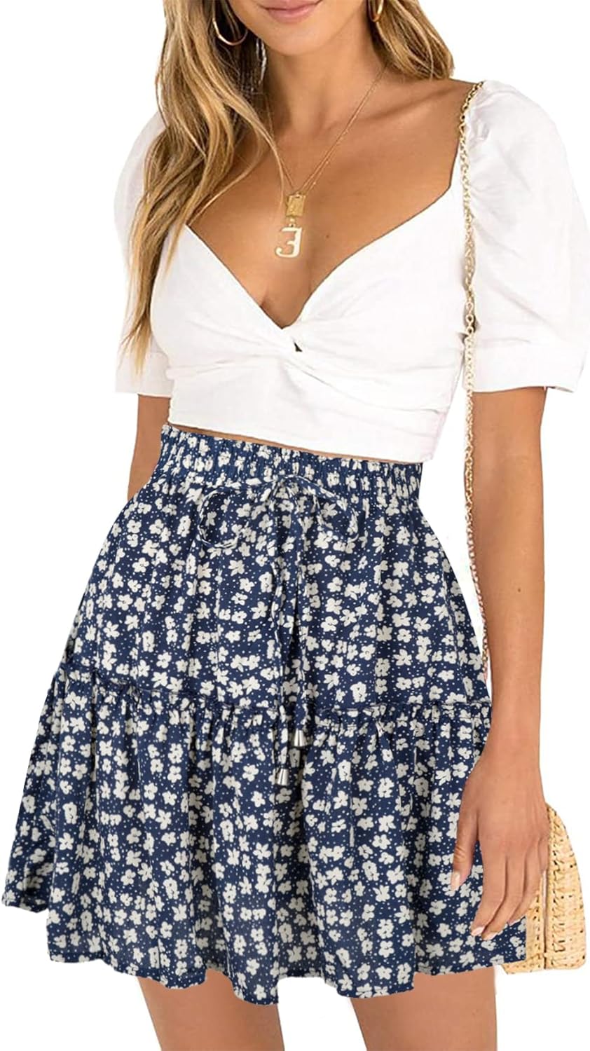 Women's High Waisted Floral Mini Skirt Drawstring Boho Print Ruffle Summer Short Skirts
