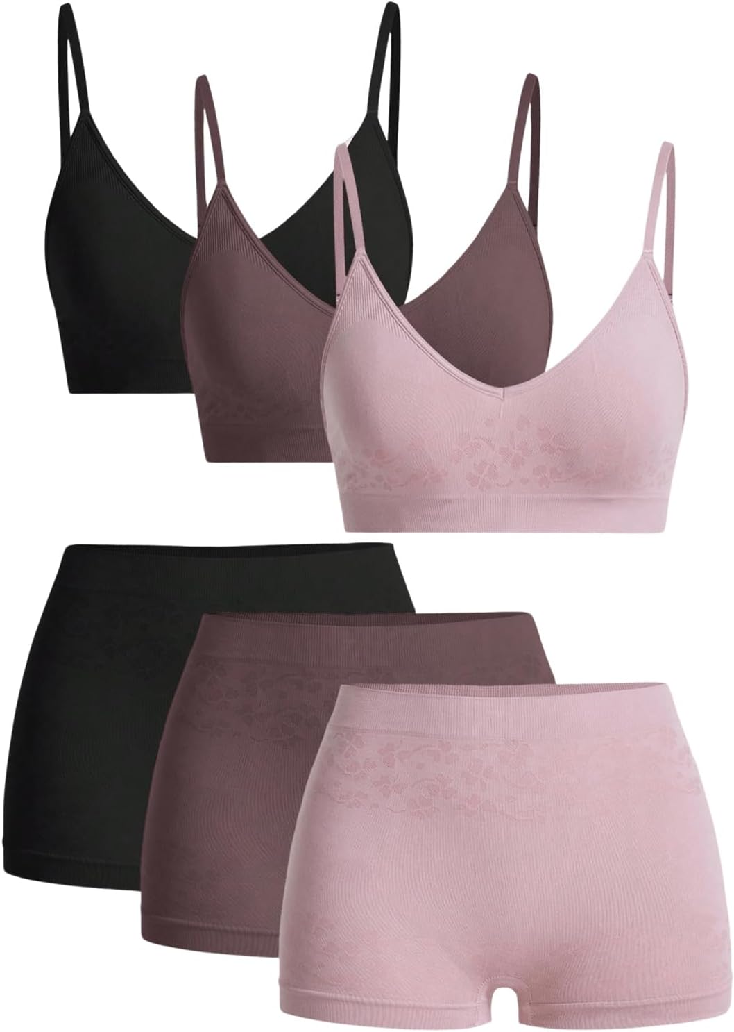 Women's 6 Piece Lingerie Set Floral Wireless Unlined Bra Seamless Bralette and Boyshorts Boxer Briefs Underwear Sets