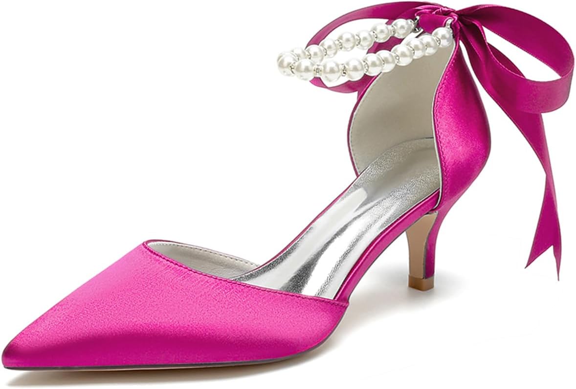 Women's Pointed Toe Kitten Heels Satin Bridal Pumps Ankle Strap Pearls Stilettos Wedding Prom Party Dress Shoes