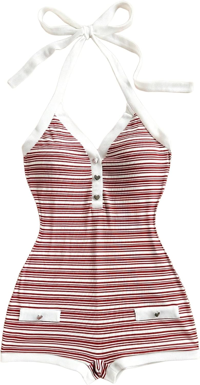 Verdusa Women's Striped Halter Romper Casual Summer Sexy Romper Short Date Night Outfits
