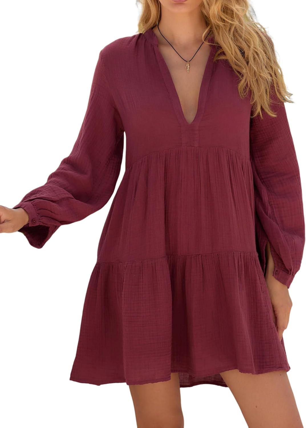 R.Vivimos Cotton Casual Dresses for Women Long Sleeve V Neck Tiered Flowy Mini Tunic Dress