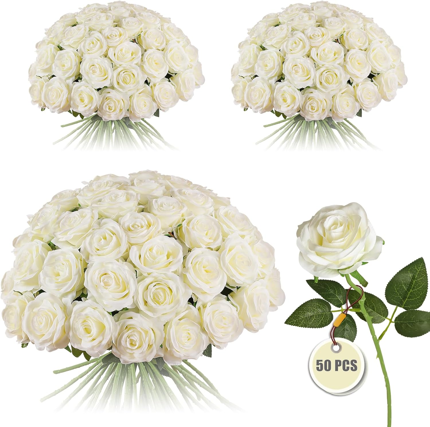 50PCS Artificial Silk Roses Flowers – Realistic Fake Roses in Bulk & Bouquet Long Stem White Rose for Wedding Centerpieces, Home Decor, Floral Arrangements, Party Decoration (White)