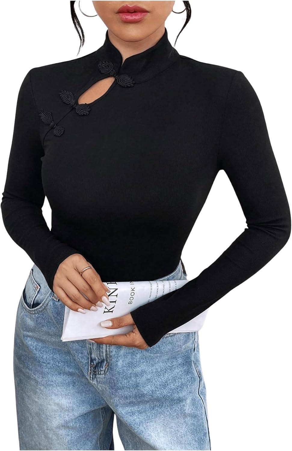 SweatyRocks Women's Long Sleeve Knit Ribbed Cheongsam Button up Mock Neck Tops