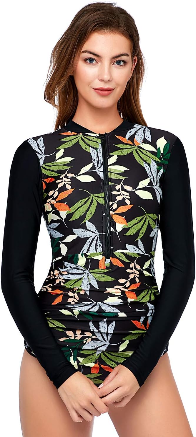 AXESEA Womens Rash Guard Long Sleeve One Piece Swimsuit Ruched Zip Bathing Suit