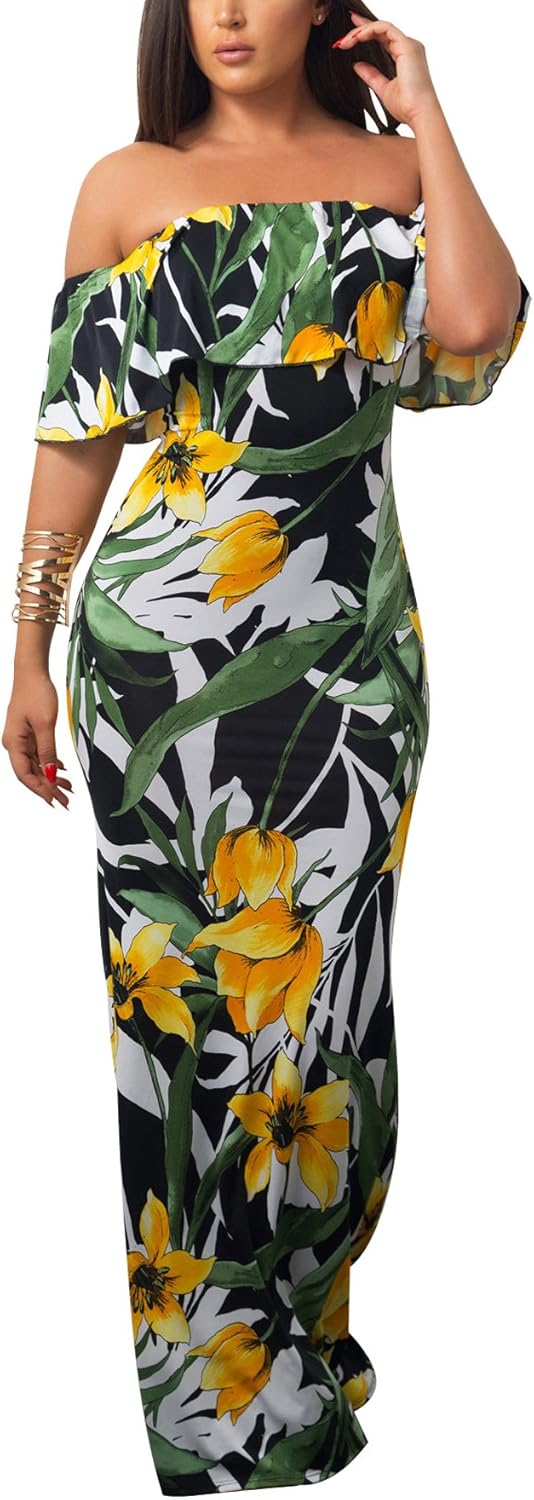 Suimiki Vintage Ruffle Plain Floral Printed Off Shoulder Bodycon Long Party Maxi Dress Dark Green Small
