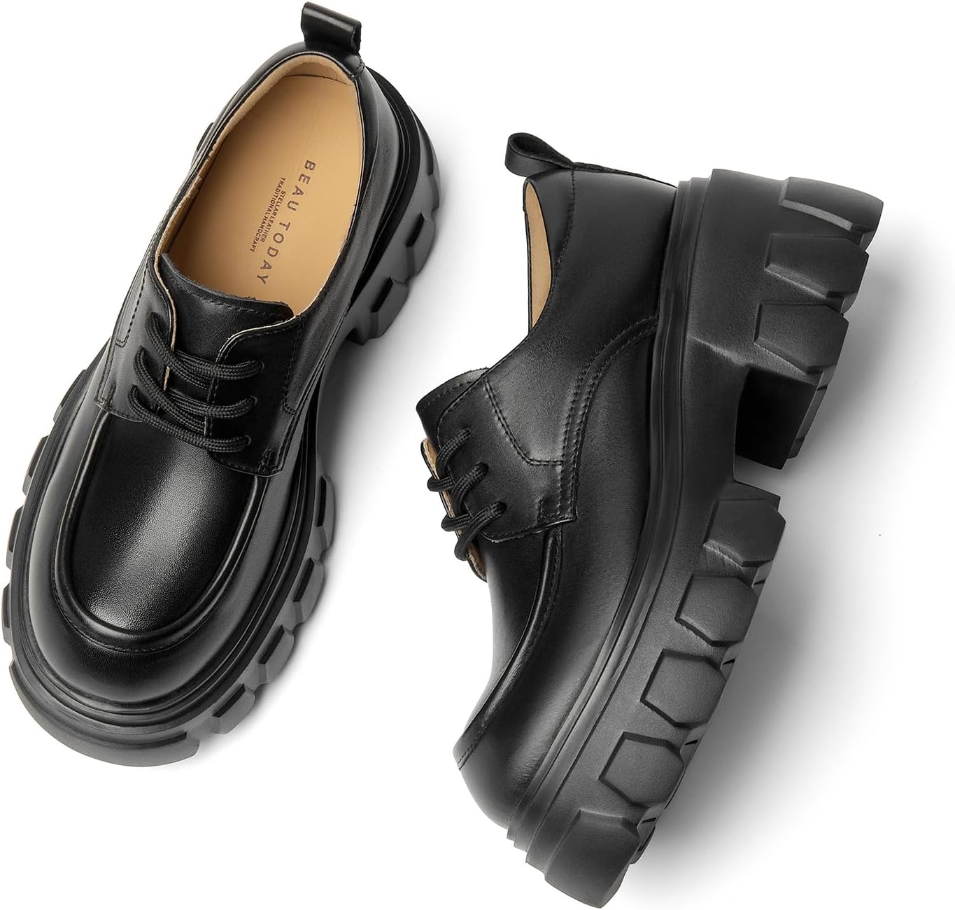 BEAU TODAY Platform Oxfords for Women, Oxford Shoes for Women, Chunky Leather Lace Up Oxfords,Casual Comfortable Breathable Non-Slip Dress Shoes for Work Business