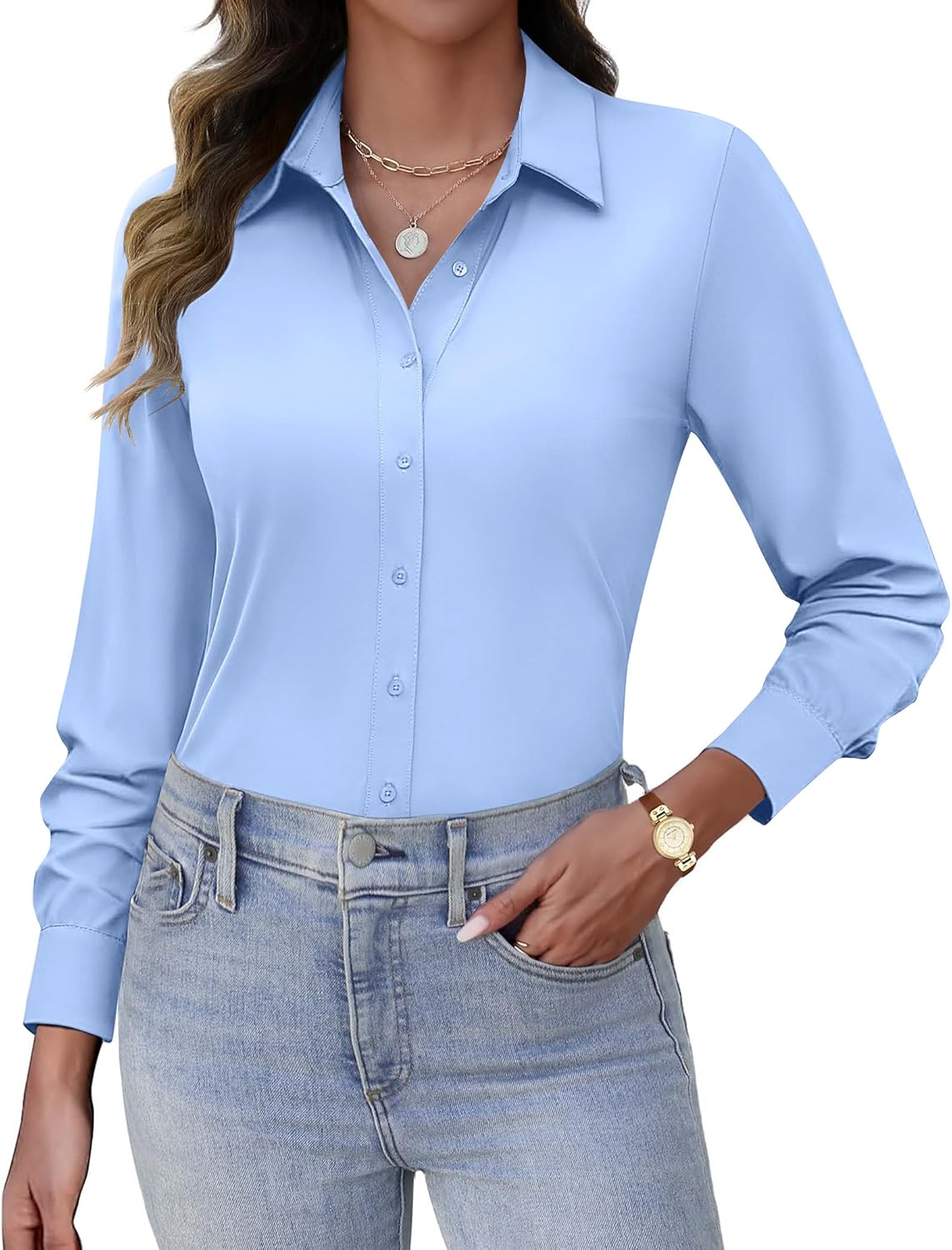 HOTOUCH Button Down Shirts for Women Long Sleeve Stretch Dress Shirts Wrinkle-Free Work Blouses Slim Fit Office Tops