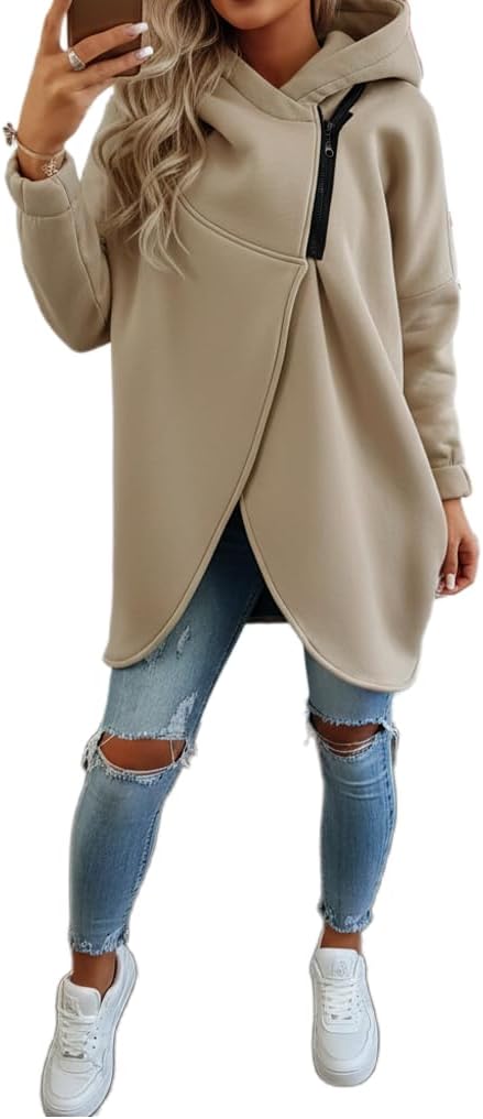 Women's Asymmetric Half-Zip Hooded Sweatshirt Long Sleeve Fall Winter Oversized Tunic Top with Pockets