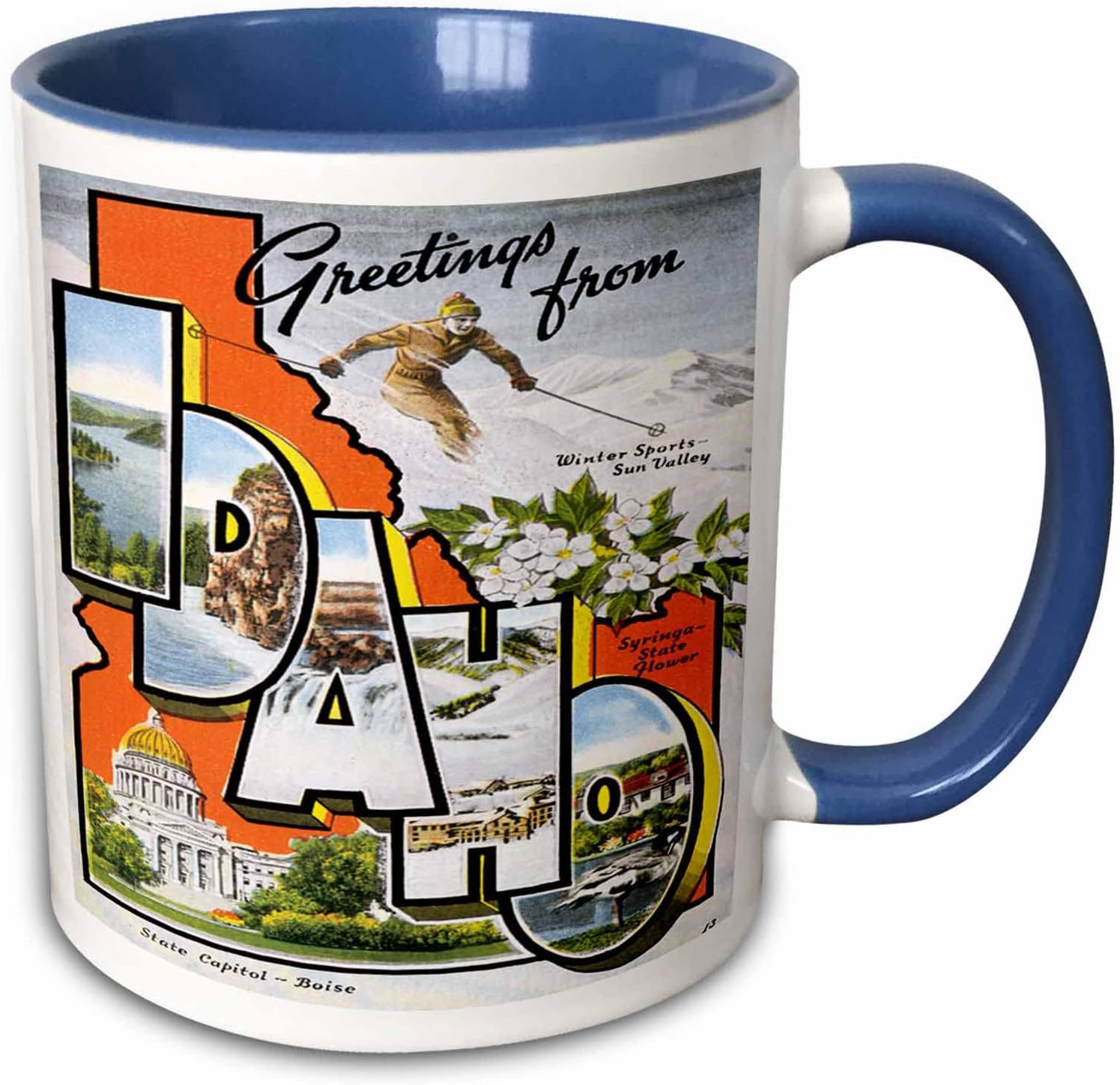 3dRose mug_169565_6 Greetings from Idaho Sun Valley Boise with Scenes from the State - Two Tone Blue Mug, 11oz