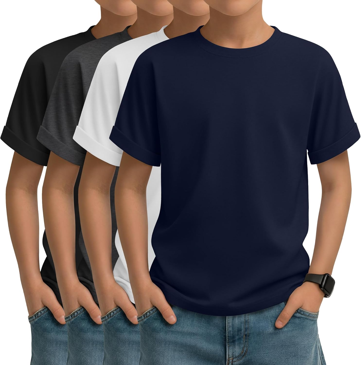 4 Pack Boys Short Sleeve Shirts Crewneck Kids Loose Fit Basic Casual Youth Soft Solid Plain Tees