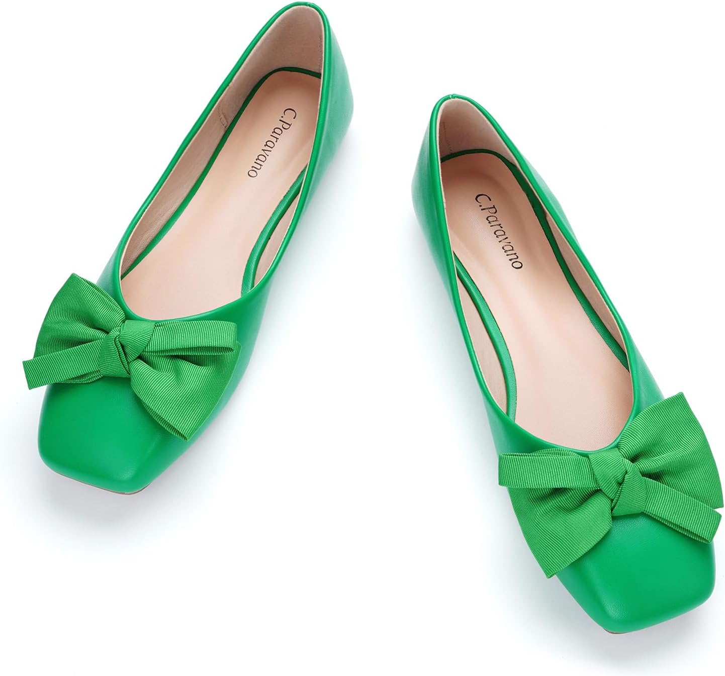 C.Paravano Women's Flats | Square Toe Shoes for Women | Green Flat Shoes | Womens Flat Leather Shoe | Slip On Ballet Flats (Size 10,Green Square)