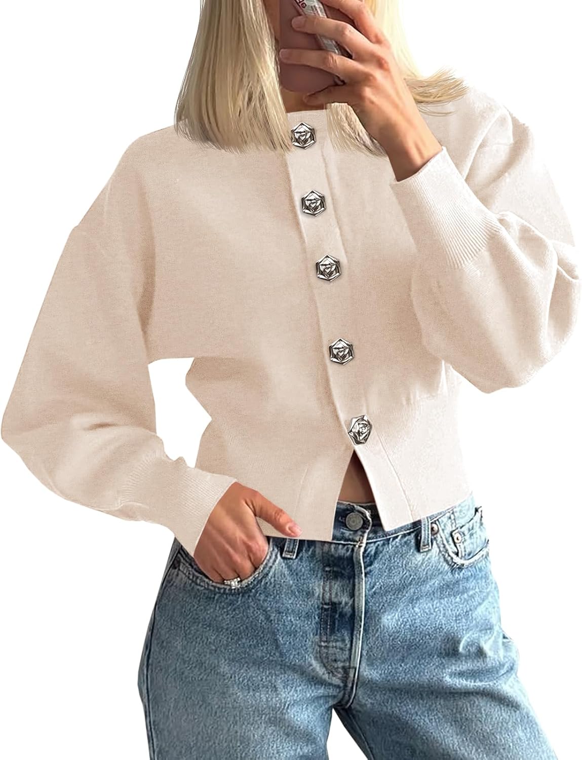Saodimallsu Womens Button Up Cardigan Sweaters Fall Trendy Long Lantern Sleeve Knit Crew Neck Sweater Jacket
