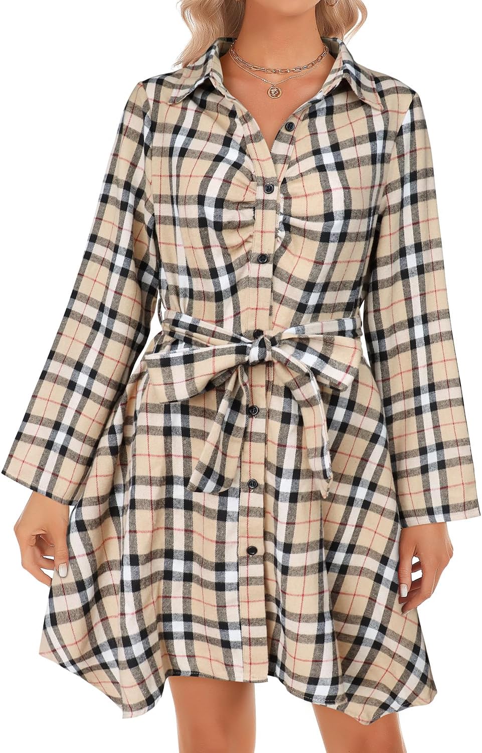 FANCYINN Womens Plaid Shirt Dress Pleated Front Chest Irregular Hem Buttons Autumn Casual Long Sleeve Checker Flannel Dresses Apricot & Black S