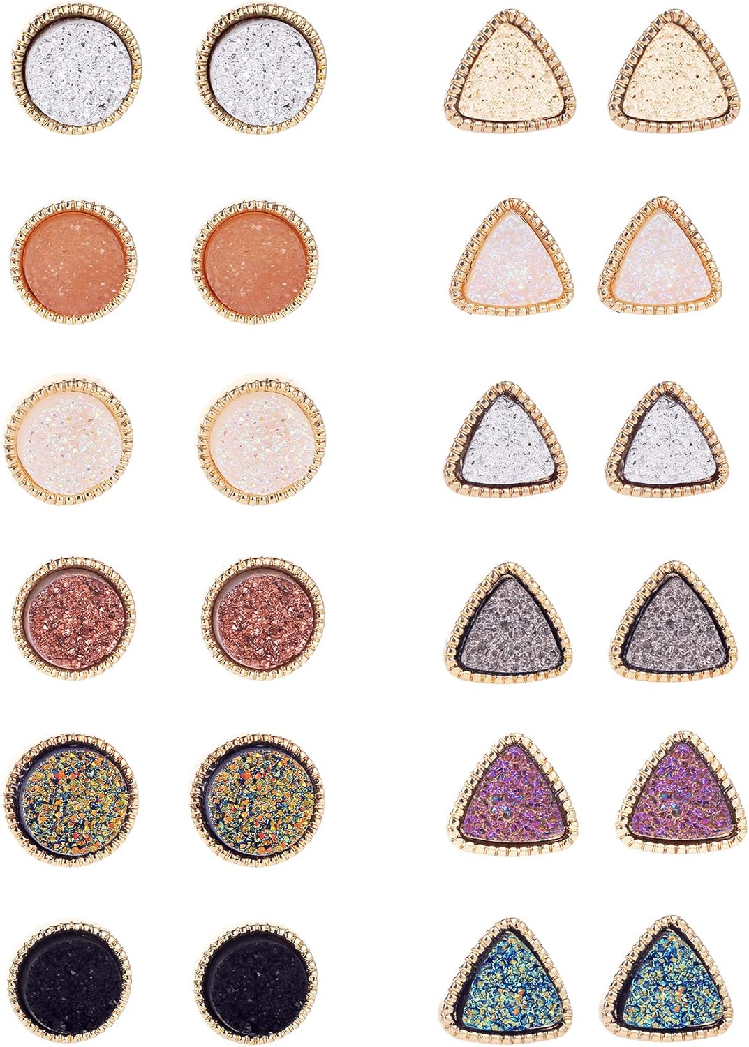 12 Pairs Druzy Stud Earrings for Women 12mm Round Triangle Resin Cluster Stud Earrings Set Stainless Steel Pierced Gold Black Multicolor