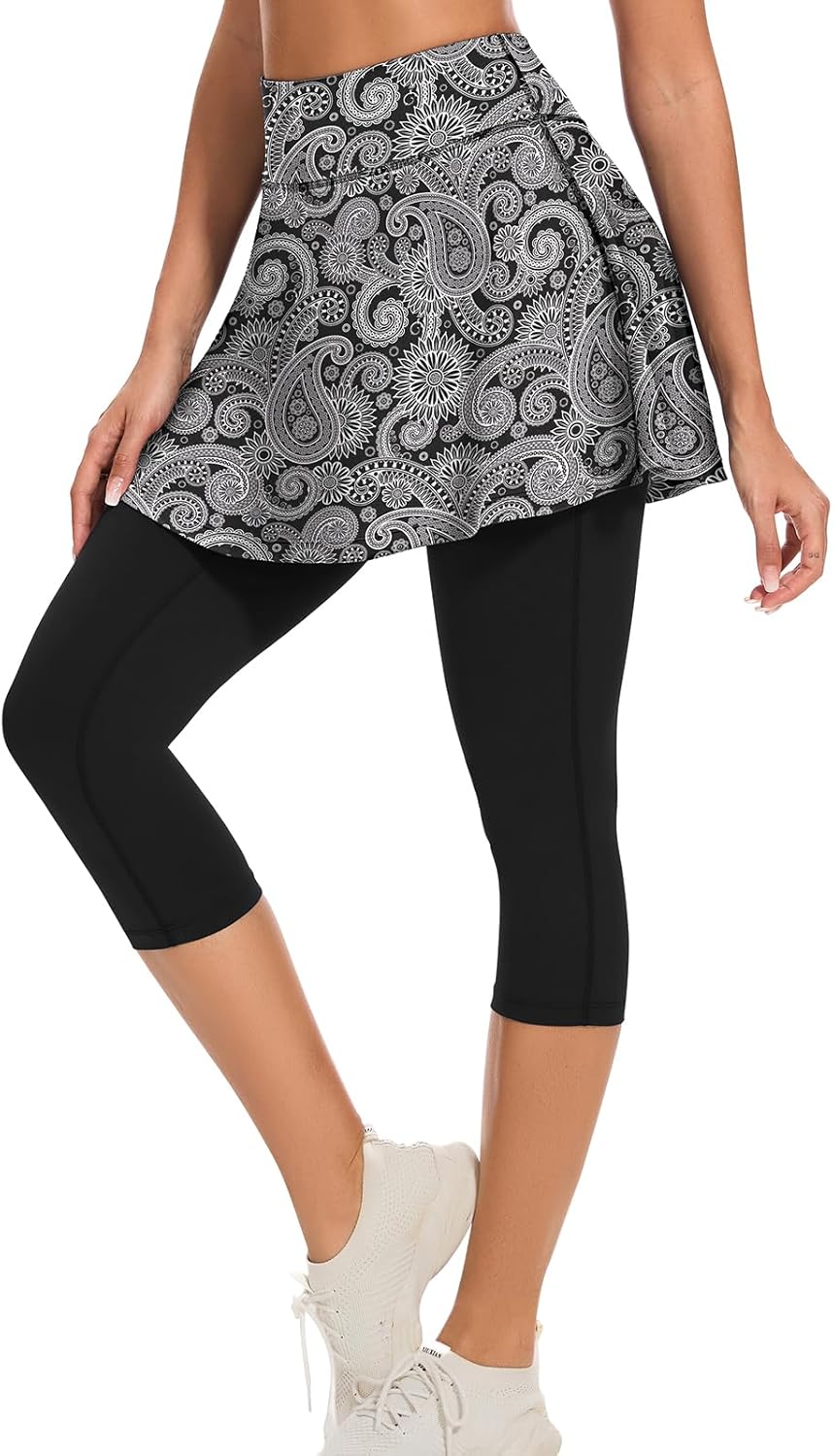 WOWENY Tennis Skirted Leggings for Women Athletic Skirt with Capri Leggings Golf Pickleball Yoga Legging with Skirts Pockets