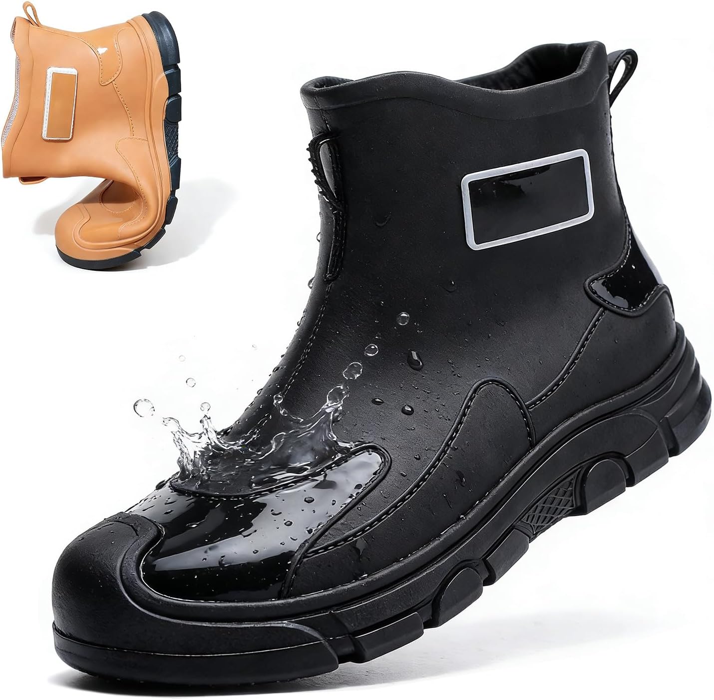 Women's Rubber Flat Wide Calf Rain Boot Fashion Round Toe Anti-Slip Lug Sole Slip on Garden Boots for Camping Farming Deck Outdoor Work
