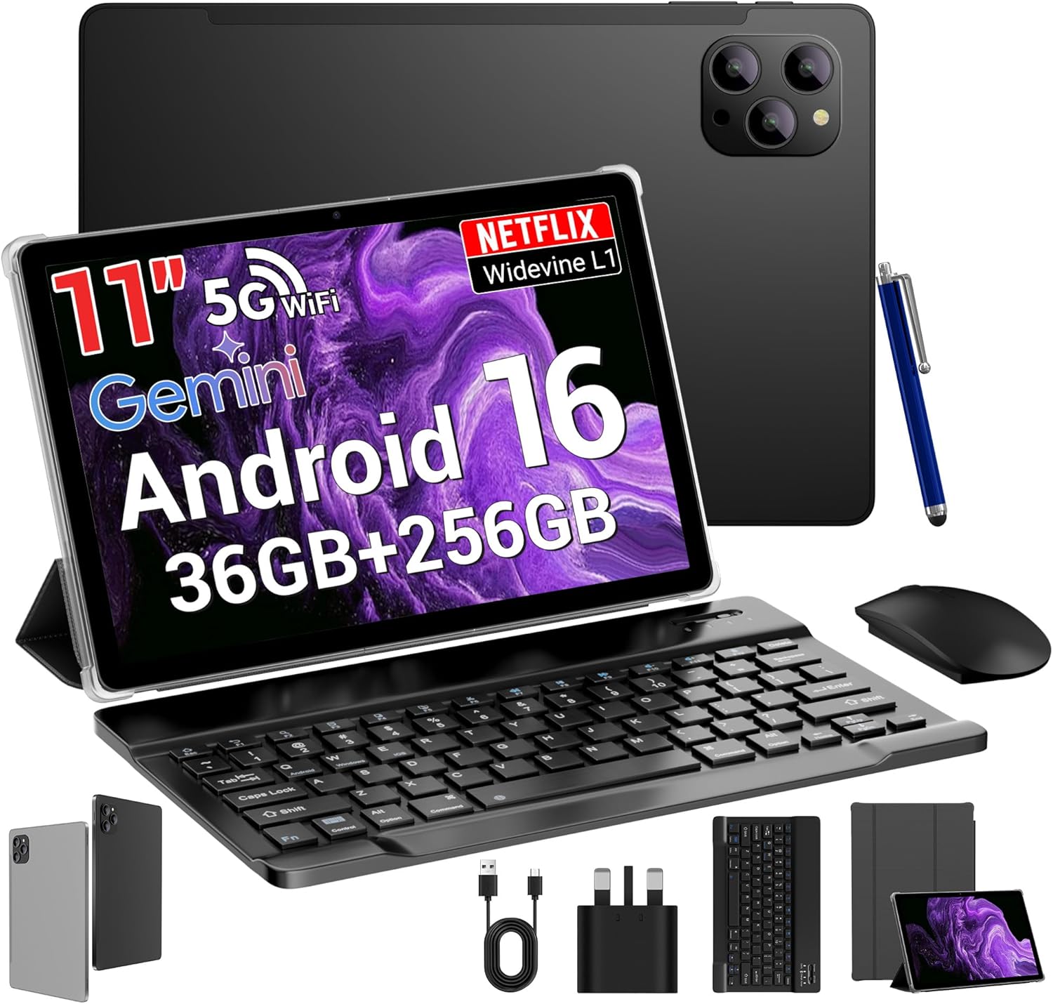 2025 Slim 11 Inch Android 16 Tablet with Keyboard,Stylus & Mouse, 2K IPS Widevine L1, 36GB RAM 256GB (1TB TF), 8000mAh, T615 8-Core,8+13MP, 5G/2.4G WiFi, FCC/CE Certified - Black