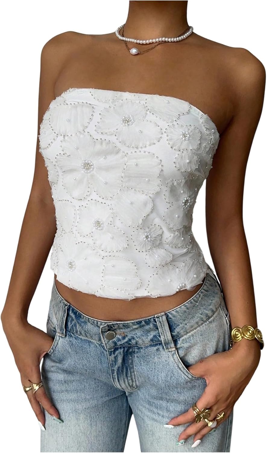 MakeMeChic Women's Floral Tube Top Elegant Beaded Strapless Bandeau Sleeveless Going Out Crop Tops
