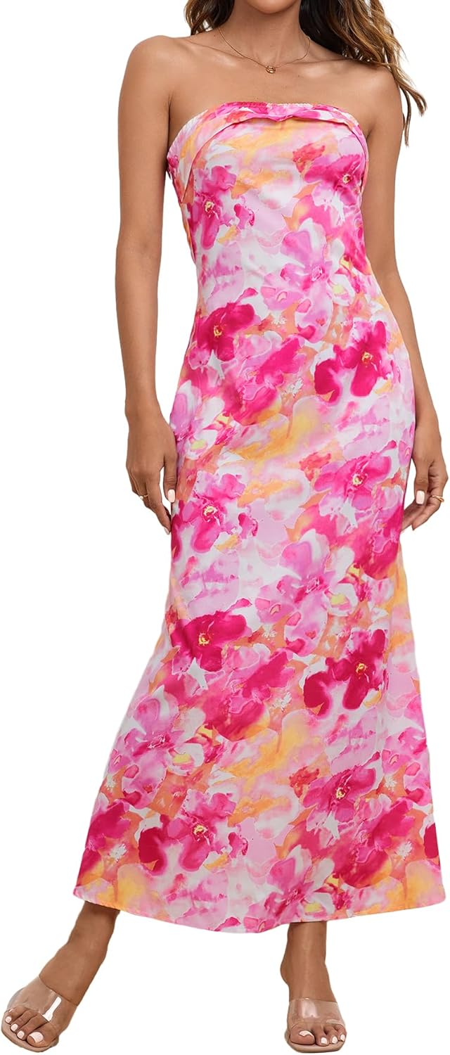OYOANGLE Women's Floral Print Sleeveless Strapless Draped Backless Bodycon Summer Maxi Tube Dress