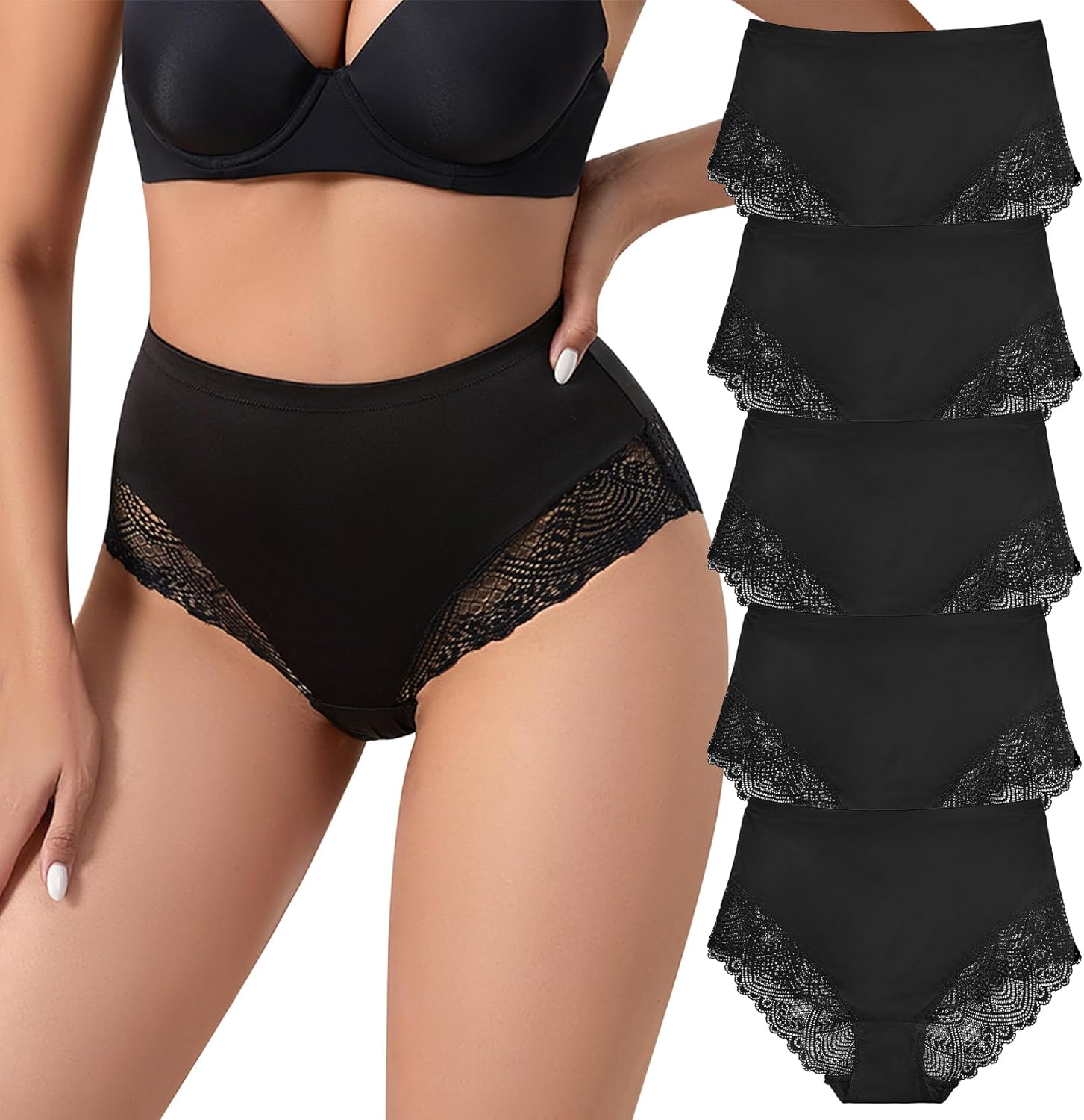 Cevapro High Waisted Underwear for Women Sexy Lace Seamless Panties Full Coverage Soft Stretch Ladies Briefs 5 Pack