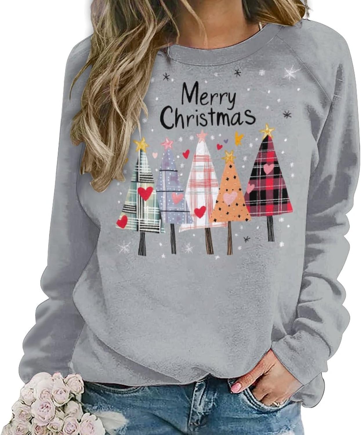 HOTYD Womens Cute Christmas Tree Print Sweatshirt Casual Long Sleeve Crew Neck Graphic Sweatshirt Oversized Pullover Tops