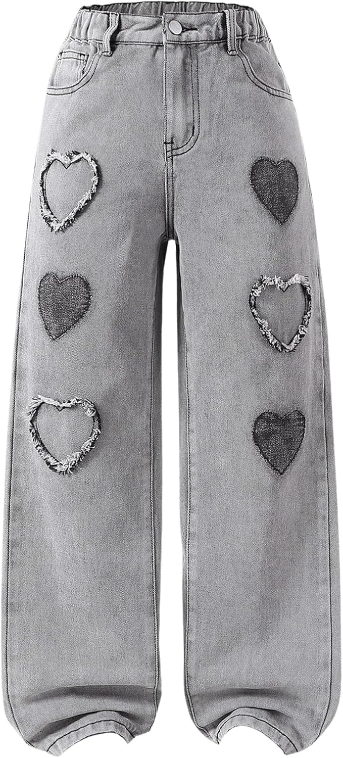 WDIRARA Girl's Bowknot Print Washed Jean Elastic Waist Denim Pants Straight Leg Trousers with Pockets