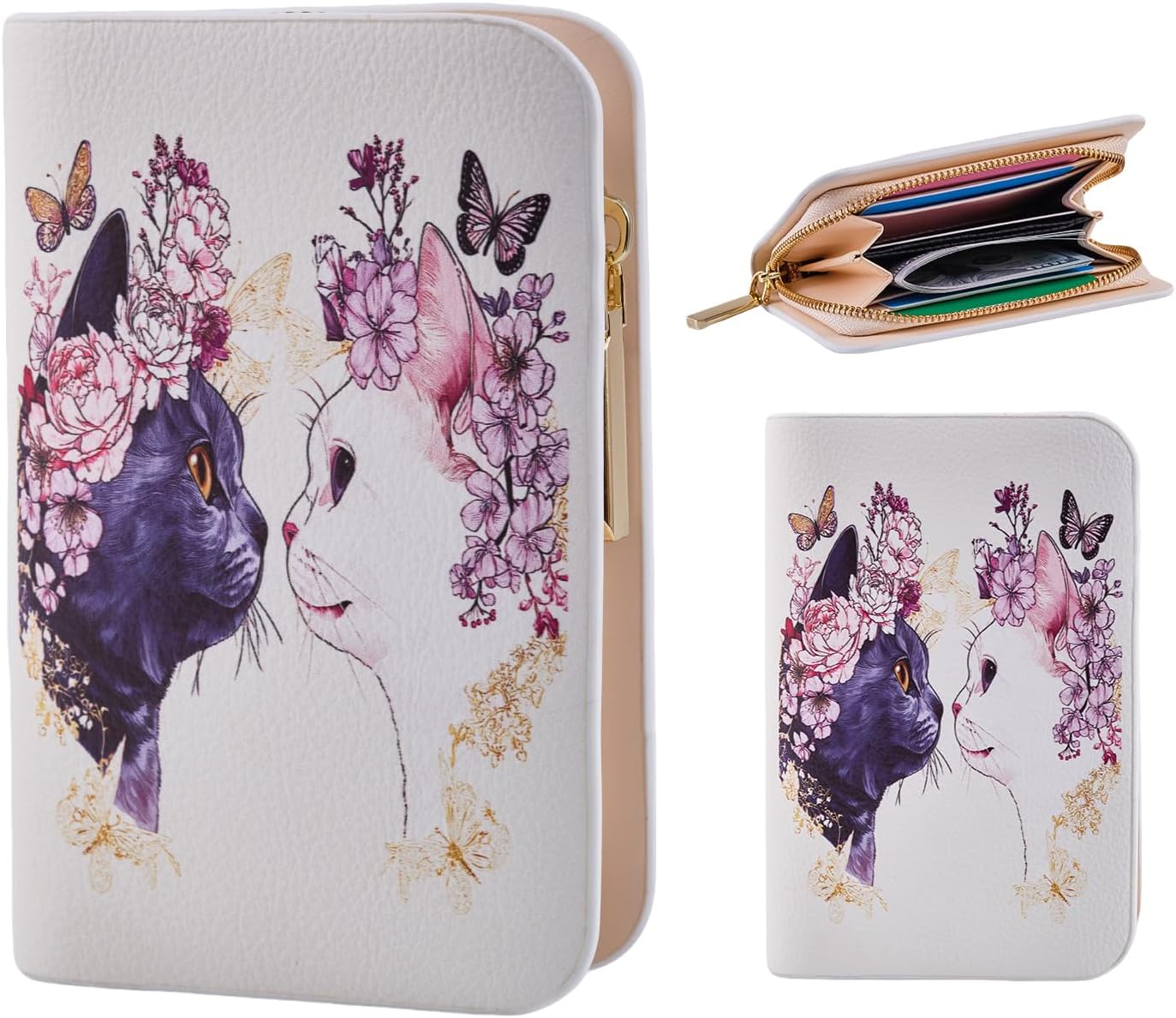Cute Women Wallet, PU Little Women Coin Purse Wallet-Zipper Pocket Wallet,Small Slim Thin Credit Card Wallet for Female Ladies Teen Girls Girly,Cat Pattern (YinYang Bloom Cats)