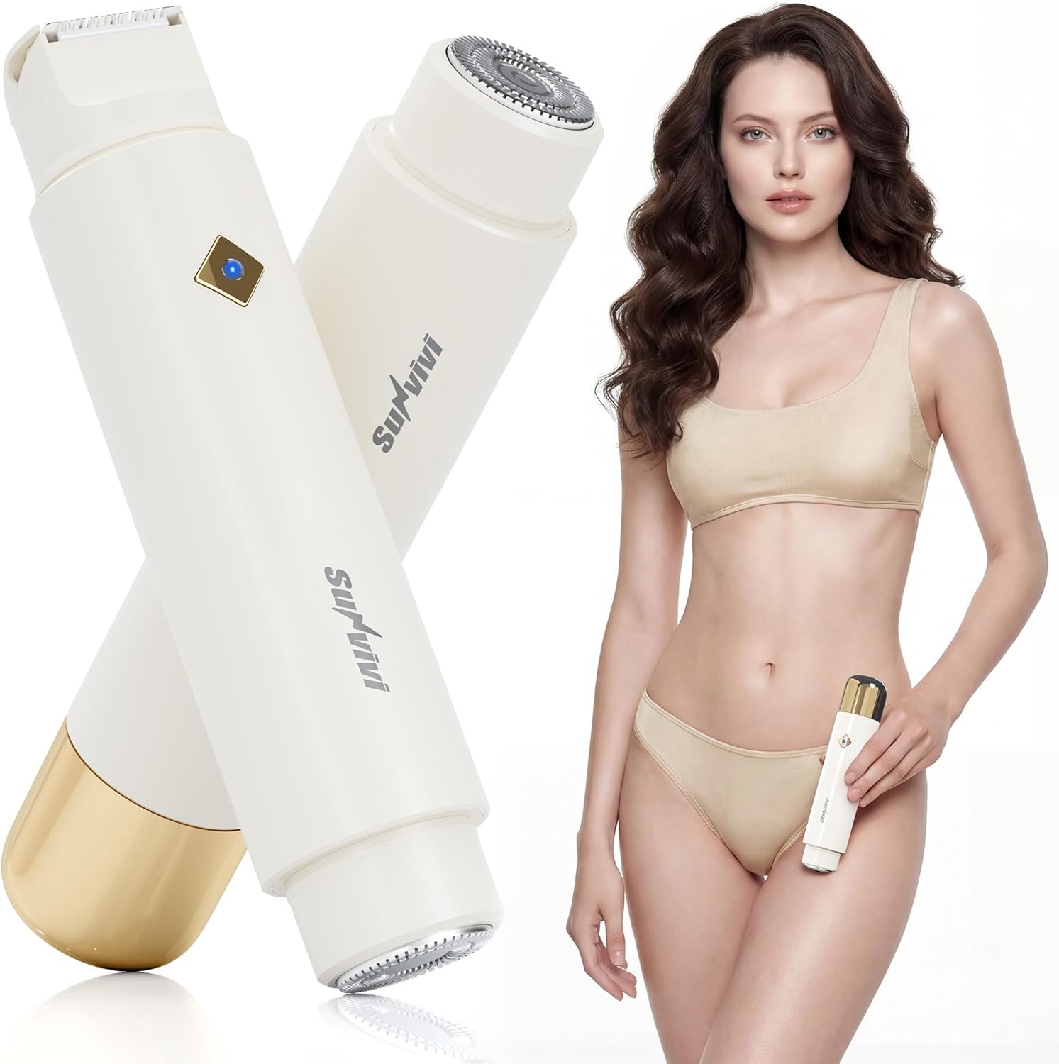 SUNVIVI Bikini Trimmer for Women: IPX6 Waterproof Dual Head Pubic Razor, Painless Face Shaver Body Trimmer, Portable Hair Removal Kit for Bikini Underarm Leg Arm Body Face, White