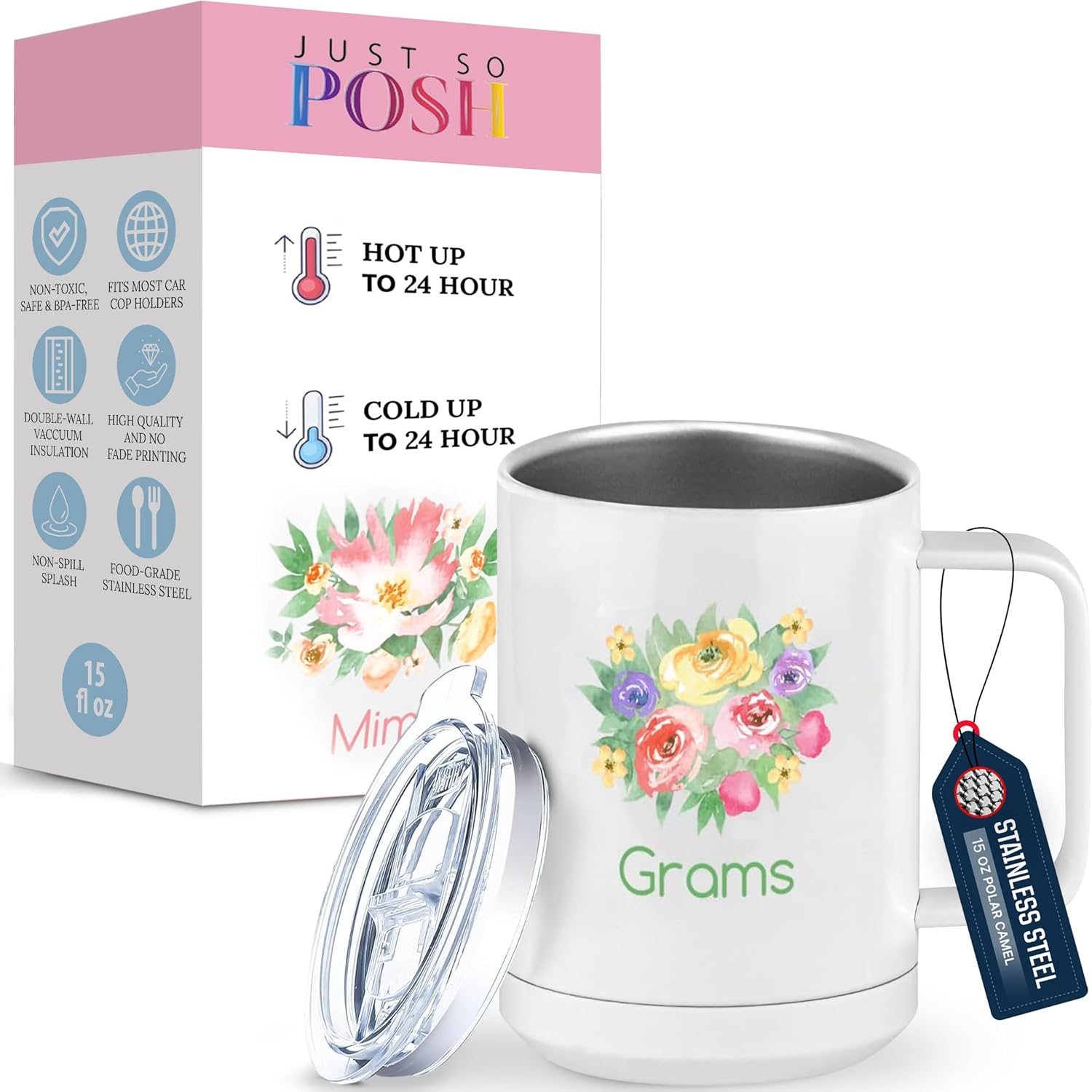 Just So Posh Grams Flowers Tumbler, Coffee Mug with Handle and Slider Lid, White 15 oz Polar Camel, Stainless Steel, Vacuum Insulated