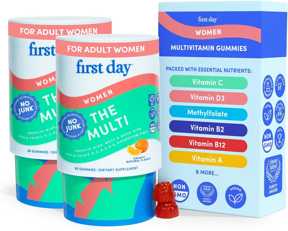 - Empower Your Day with Women's Multivitamin: First Day's gummies are thoughtfully crafted with a blend of organic fruits and vegetables, including apples and blueberries, to support women's health; they fill in the nutrient gaps of modern diets, providing essential vitamins for energy, focus, and growth. Enjoy more folate than 1½ cups of spinach; perfect supplements multivitamins for women seeking vibrant health, clarity of mind, and vitality in every moment.