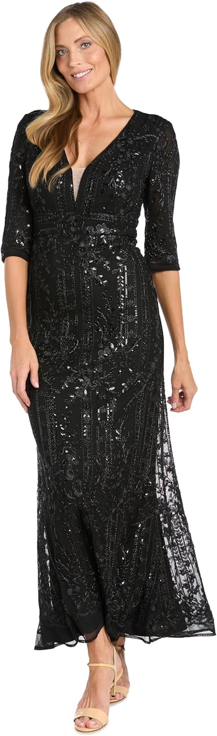 R&M Richards Women's Long Sequin Embellished Gown | Elegant V-Neck 3/4 Sleeve Dress | Cocktail Party & Special Occasions