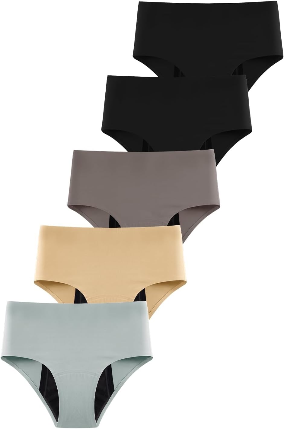 TIICHOO High Waist Period Underwear for Women Heavy Flow Leak proof Seamless Period Bikini Underwear Pack of 5 (Medium, 2Black/Coffee/Khaki/Smoke Green)