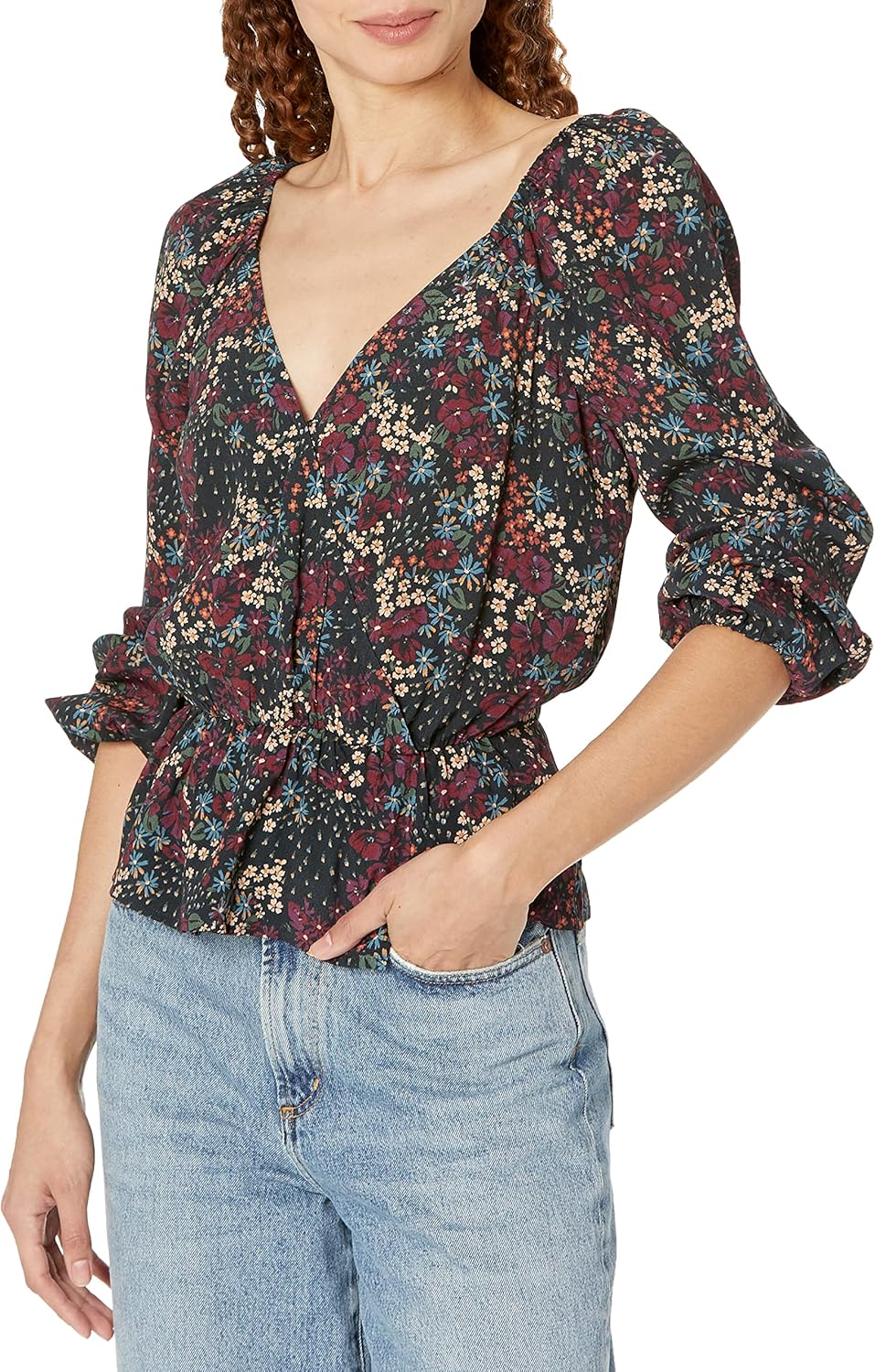 PAIGE Womens Clara Top Long Sleeve Faux Wrap Sweetheart Neckline in Black Multi