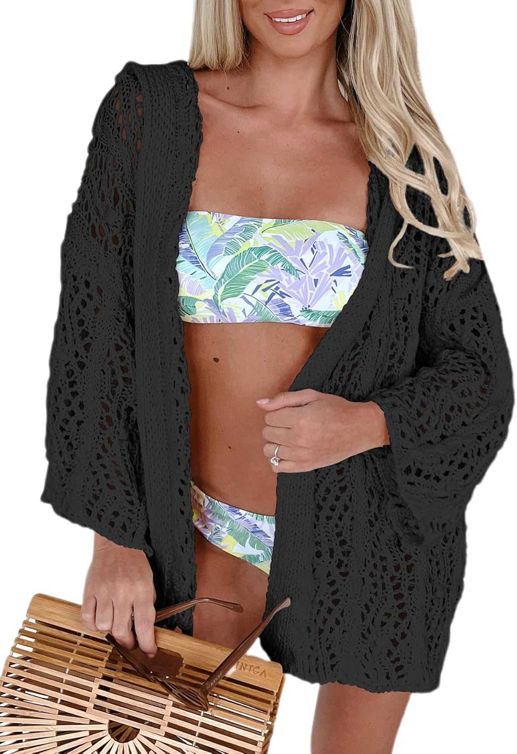 Women's Lightweight Crochet Cardigan Sweaters Long Sleeve Open Front Knit Summer Boho Hooded Beach Cover up