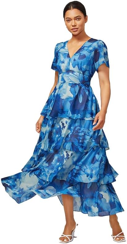 ADOR Women's Floral Summer Empire Waist V Neck Casual Long Flowy Chiffon Maxi Dress Ruffle Tiered Short Sleeve A-line Dreses