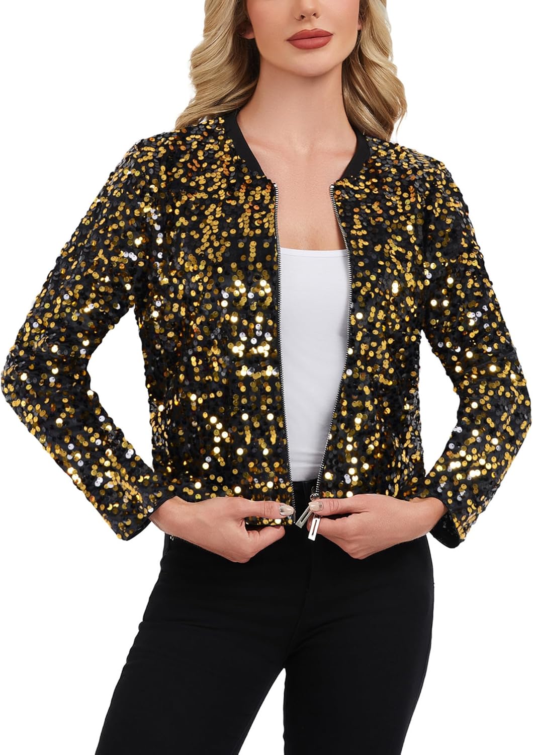 Anna-Kaci Women's Long Sleeve Sequin Zip Up Bomber Jacket Glitter Shiny Party Coat with Elastic Hem and Cuff