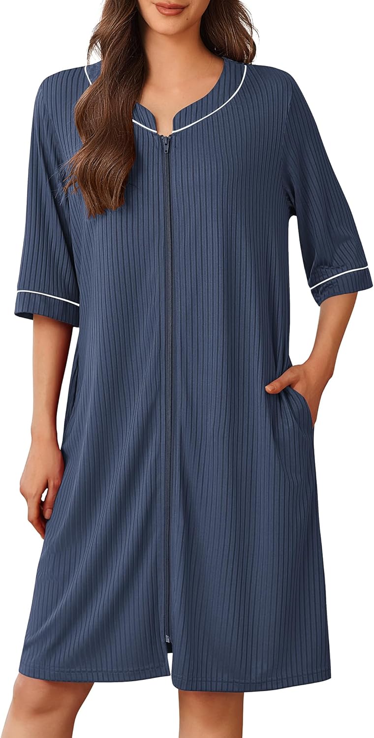 Ekouaer Women Robes Zipper Front 3/4 Sleeve Housecoat Zip Up Bathrobes Lightweight Sleepwear with Pockets Blue Purple X-Large