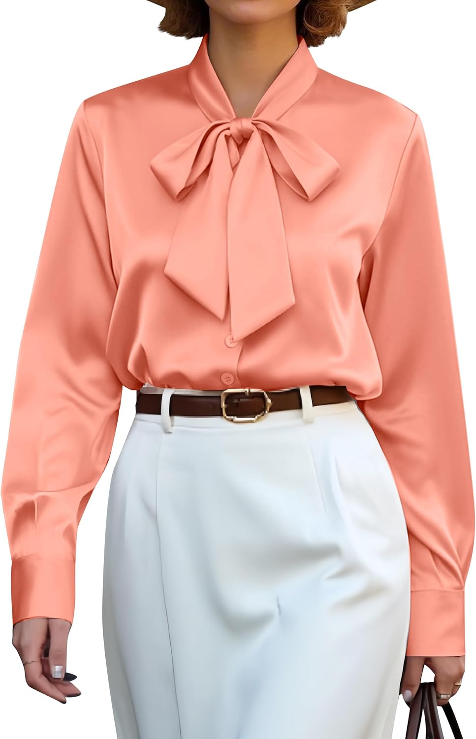 CBOO Women's Bow Tie Neck Button Down Shirts Silk Blouses Long Sleeve Elegant Satin Blouse Casual Dressy Business Tops