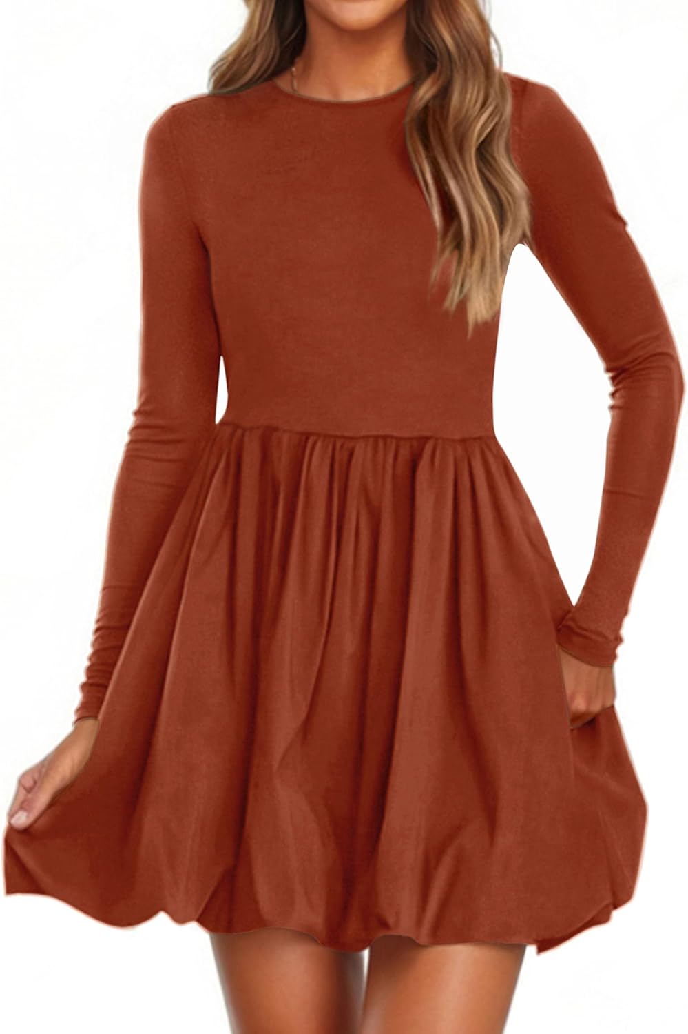 PRETTYGARDEN Fall Dresses for Women 2026 Casual Long Sleeve Bubble Cute Crew Neck A Line Mini Short Dress with Pockets