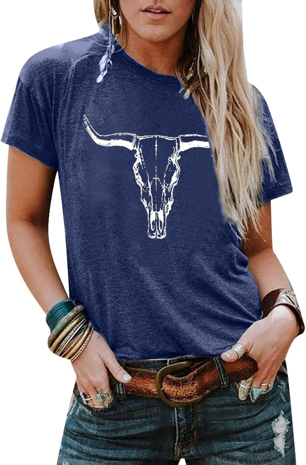 Women Crew Neck Short Sleeve Vintage Country Music Tshirt Cute Cattle Skull Graphic Concert Outfit Tops