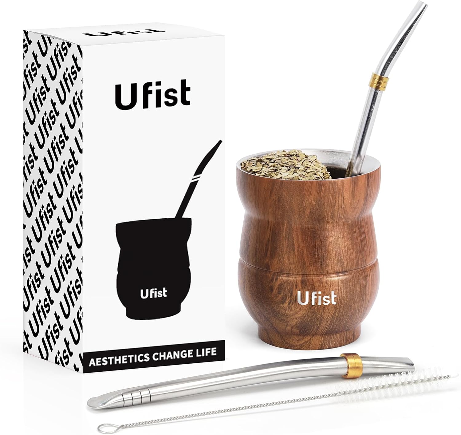 Yerba Mate Cup Set, 4.8oz Double-Wall Stainless Steel, with 2 Bombillas and Cleaning Brush (Wood Grain)