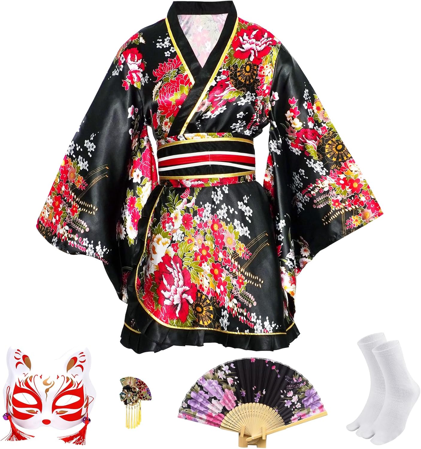 Geisha Costume for Women,Japanese Kimono with Fox Mask & Accessories,Anime Cosplay Halloween Costumes,S