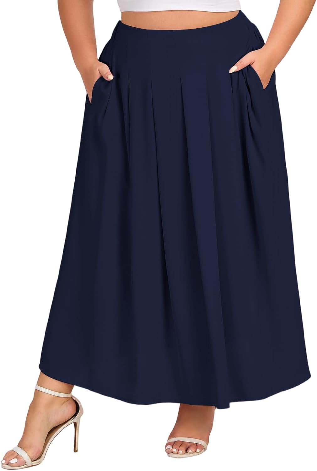 Moon Wood Women's Plus Size High Waist Elastic Long Maxi Skirt Flowy Pleated A-Line Casual Swing Summer Skirt with Pockets
