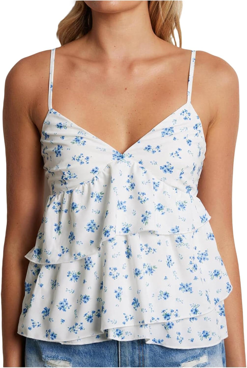 Women Y2K Floral Babydoll Top Sleeveless Spaghetti Strap Ruffle Tank Top Summer Cute Flower Print Peplum Cami Vest