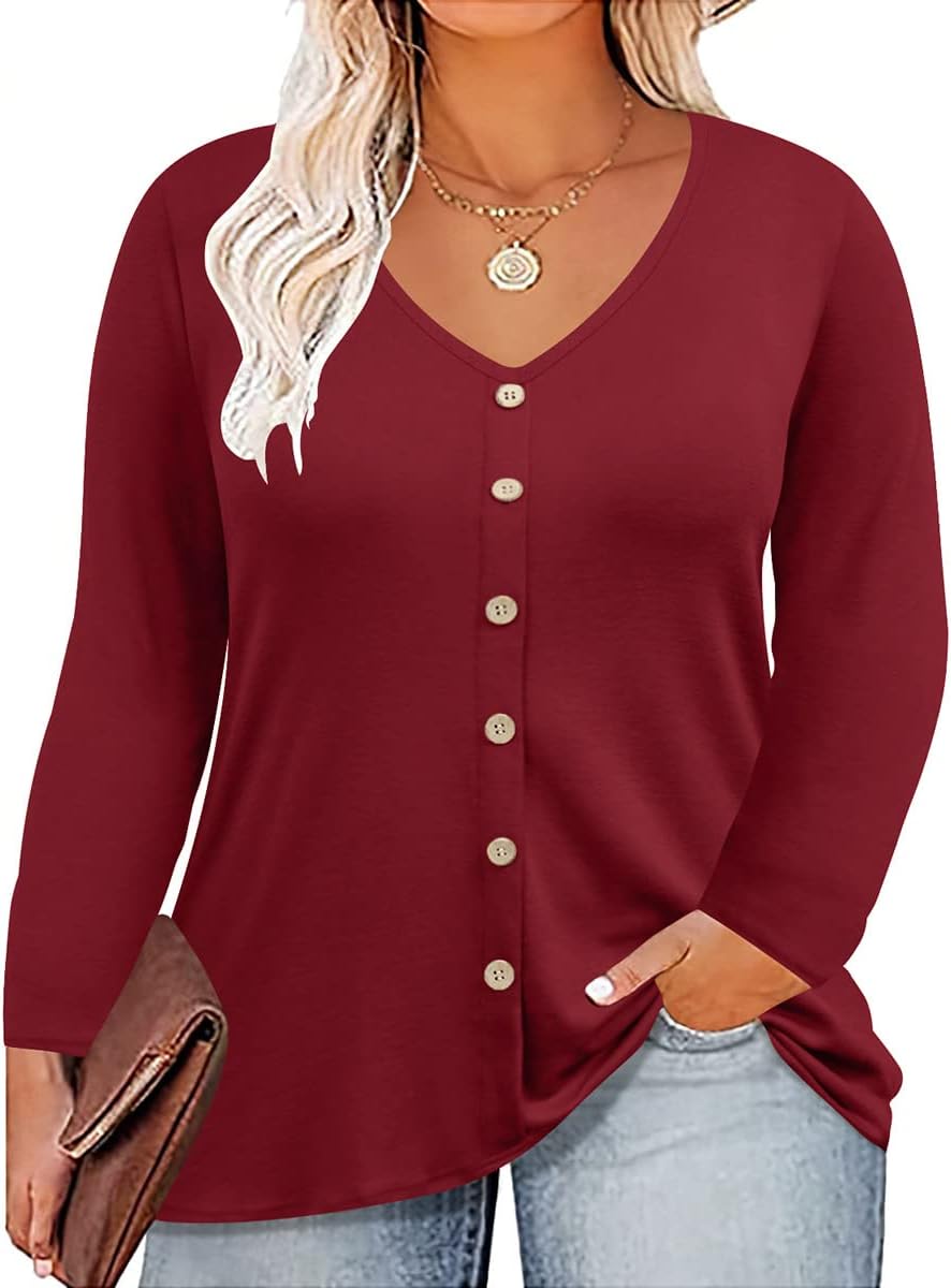 TIYOMI Plus Size Tops for Women Long Sleeve Henley V Neck Tunic Button T Shirts Fall Blouses XL-5XL