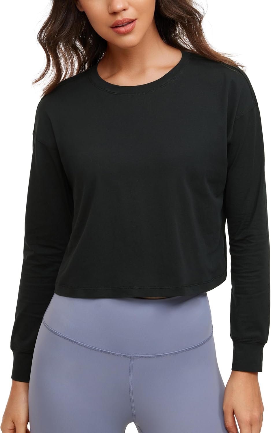 CRZ YOGA Womens Pima Cotton Workout Long Sleeve Shirts Loose Athletic Yoga Tops Basic Casual Fall Crop T-Shirts