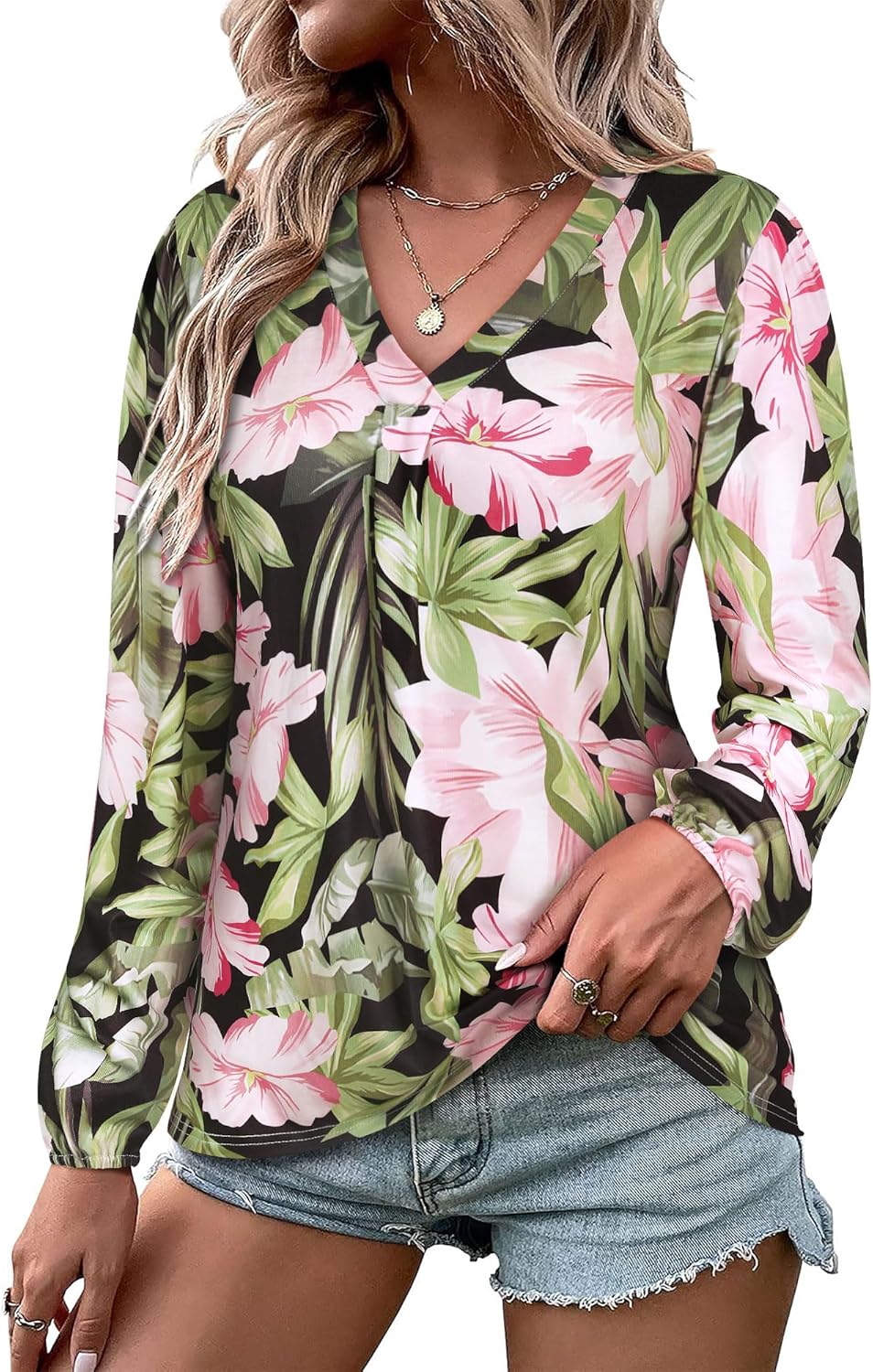 ZXZY Womens Hawaiian Shirt Vintage Leaf Floral Printed Tropical Tops V Neck Puff Long Sleeves Shirts
