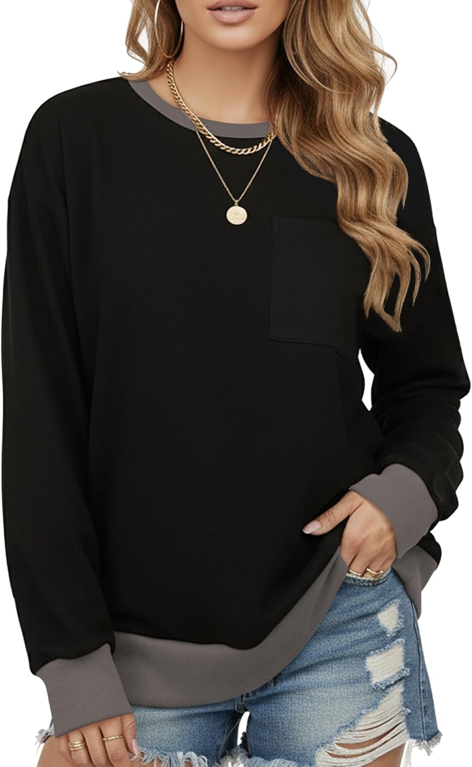 AURUZA Sweatshirt for Women Color Block Crewneck with Chest Pocket Casual Long Sleeve Loose Fit Tops Fall Sweatshirt Fashion